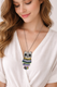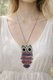 Collar de bisutería con diseño de búho dorado y rojo. Cadena larga de 70 cm en tonos azules. Pieza versátil y elegante para complementar cualquier estilo con sofisticación.